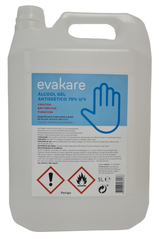 Desinfetante para mãos à base de álcool etílico 70% (v/v) Atividade virucida contra todos os vírus envelopados de acordo com a norma EN14476:2013+A2:2019. Eficácia bactericida de acordo com a norma EN1276:2009. Eficácia fungicida de acordo com a norma EN 1650.